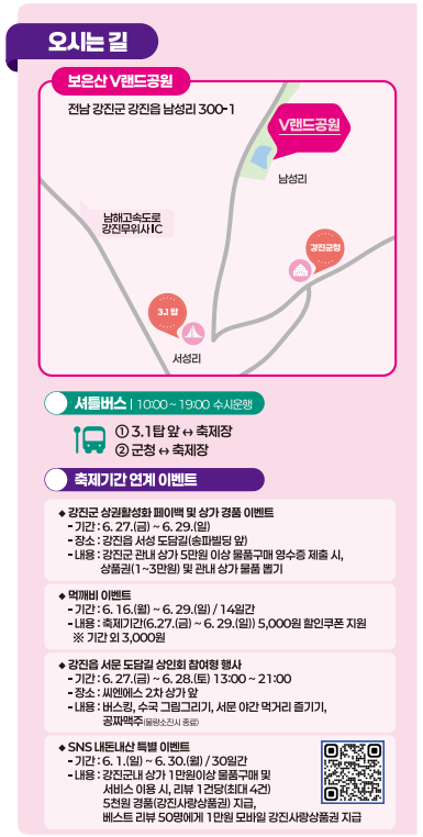 - 주 행사장: 브이랜드 공원 (전라남도 강진군 강진읍 남성리 300-1)