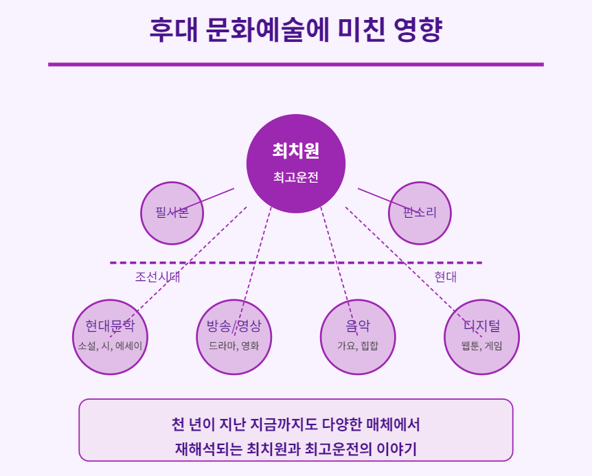 디지털 콘텐츠: 웹툰, 모바일 게임, VR 체험 등 최신 미디어에서도 최치원과 '최고운전'의 이야기가 활용되고 있어요. 특히 교육용 콘텐츠에서 한국 문화의 심층을 보여주는 소재로 자주 등장하죠.