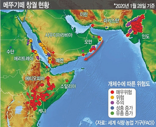 메뚜기떼의 발생 원인은 기후온난화이다. 이 지역은 평소에도 건조한 기후로 유명하다. 하지만 기후변화로 인한 강수량의 변화, 기상 패턴의 변화 등이 이어지면서 해충이 증식하는 환경이 조성되었다. 이전까지는 그나마 가뭄 기간에는 메뚜기가 발생하지 않았는데, 2020년은 가뭄 기간과 비가 오는 기간의 경계가 모호해져서 메뚜기가 증식하는 환경이 계속되었다. 또한 이러한 조건이 지속되면서 메뚜기들은 몸집이 커지고 번식력도 증가하였다.