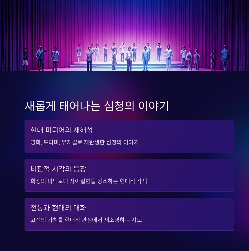 | 웹툰 '모던 심청' | 2010년대 | 현대적 자아실현 | 개인의 희생보다 함께 문제를 해결하는 공동체 모델 제시 |