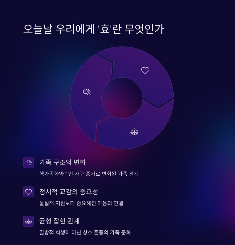 - 자기희생에서 상호존중으로: 과거의 효는 자녀의 일방적인 희생과 복종을 강조했다면, 현대의 효는 세대 간 상호존중과 이해를 바탕으로 합니다. 부모와 자녀가 각자의 삶을 존중하면서도 서로 돕는 관계를 지향해요.