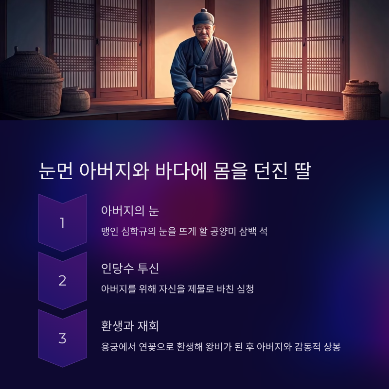 여러분, 심청전 줄거리 한번 대충 떠올려볼까요? 태어날 때부터 앞을 보지 못하는 심봉사의 딸 심청은 어머니 없이 자라면서도 아버지를 지극정성으로 모십니다. 그러다 어느 날 아버지의 눈을 뜨게 해준다는 공양미 삼백 석에 자신을 인당수에 제물로 바치기로 결심하죠. 결국 물에 뛰어들고, 용궁에 갔다가 연꽃을 타고 환생해서 임금의 왕후가 된 다음 아버지와 재회하는... 이 줄거리 맞나요? 하하, 저도 가물가물하네요.