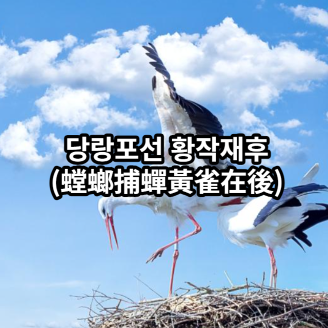 당랑포선 황작재후는 "사마귀가 미를 잡으려 할 때, 뒤에서 황새가 다가와 있다"라는 뜻으로, 단기적인 작은 이익에만 집중하면서 큰 위험을 뒤쫓지 못한다는 메시지를 전합니다.