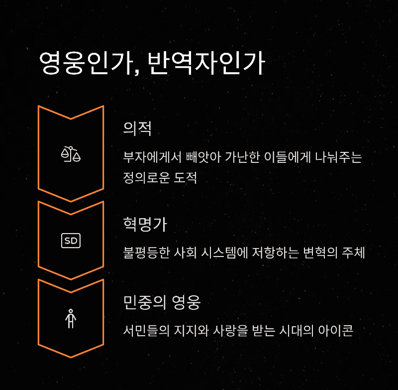| 의적으로서의 홍길동 | 탐관오리들의 재물을 빼앗아 가난한 백성들에게 나눠줌 | 사회적 약자를 위한 정의 실현자 |